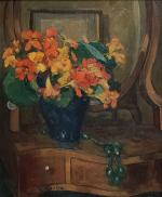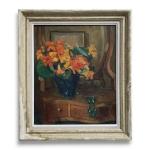 Gustave ASSIRE (1870-1941) Bouquet de fleurs sur la coiffeuse Huile sur toile signée en bas à gauche 46 x 38 cm (petite griffure)