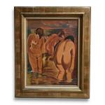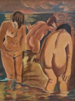 Marcel GONZALEZ (1928-2001) Trois femmes au bain, 1985. Huile sur carton signée et datée en bas à droite 63.5 x 48.5 cm à vue