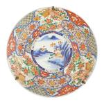 Plat en porcelaine et émaux de la famille verte à décor Imari de goût japonais, le centre présentant un décor de pagode paysagée, l'aile à décor floral et phoenix en réserves.