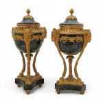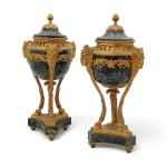 Paire de VASES couverts en bronze doré et marbre Vert de Mer à décor de têtes et pieds de bélier, feuillage Style Louis XVI H.: 42.5 cm (petites restaurations aux marbres)