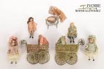 elles poussent deux landaus en plomb peint et tissus contenant chacun une mini mignonnette tout en biscuit, l'une habillée de rose et l'autre de bleu, elles sont assorties aux landaus.
