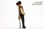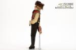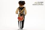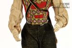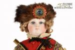 BRU (attribué à), France 19ème, poupée tête en biscuit pivotante sur collerette en biscuit, marquée en creux au sommet de la tête (illisible), yeux bleus clairs, corps raide en cuir, superbe costume de cosaque, chemise de coton et broderie, toque en fourrure, fusil en bandoulière (métal doré) avec sa gibecière, pantalon avec haut de bottes en cuirs et bottines à talons.