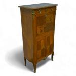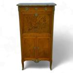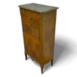 SECRETAIRE en bois de placage et marqueterie de fleurs, ouvrant par deux portes, un abattant et un tiroir, dessus de marbre Style Transition Louis XV - Louis XVI H.: 127 cm l.: 66 cm P.: 37 cm