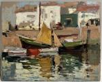 Paul Emile LECOMTE (1877-1950) L'Ile d'Yeu, bateau à la voile jaune devant le quai de Port Joinville Huile sur panneau 33 x 41 cm Bibliographie: - Revue 303, n° XX, reproduit p. 17