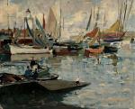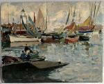 Paul Emile LECOMTE (1877-1950) L'Ile d'Yeu, voiliers et barques derrière le phare Huile sur panneau signée en bas à gauche 33 x 41 cm