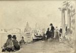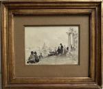 Paul Emile LECOMTE (1877-1950) Venise, personnages au bord du Grand Canal Lavis signé en bas à droite 10.5 x 14.7 cm à vue (piqûres)