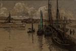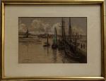 ECOLE FRANCAISE début XXème Calais, le port, 1920. Dessin rehaussé d'aquarelle et gouache signé, situé et daté en bas à gauche 16 x 23.5 cm à vue
