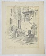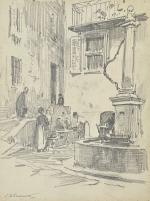 Paul Emile LECOMTE (1877-1950) La fontaine Dessin 28.2 x 21.8 cm (importantes traces d'humidité et piqûres)