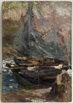 Jack ARTIGUE (XIX-XXème) Les filets bleus Huile sur carton signée en bas à gauche 41 x 29 cm Exposition: - Marseille, n°44 (étiquette au dos)