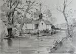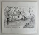 Paul Emile LECOMTE (1877-1950) Maisons au bord de la rivière Dessin et lavis signé en bas à droite avec mise aux carreaux 25.6 x 28 cm (piqûres)