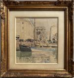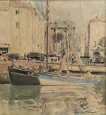 Paul Emile LECOMTE (1877-1950) La Rochelle, voiliers dans le port Aquarelle signée en bas à droite 25 x 23 cm à vue (piqûres)