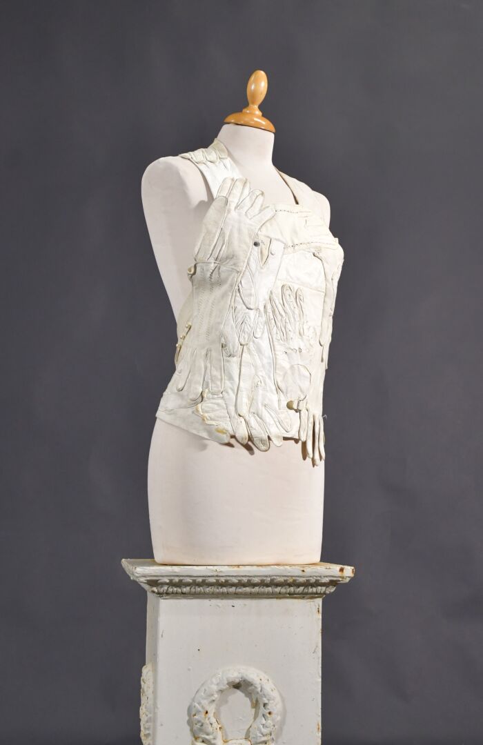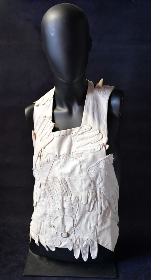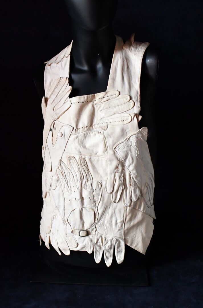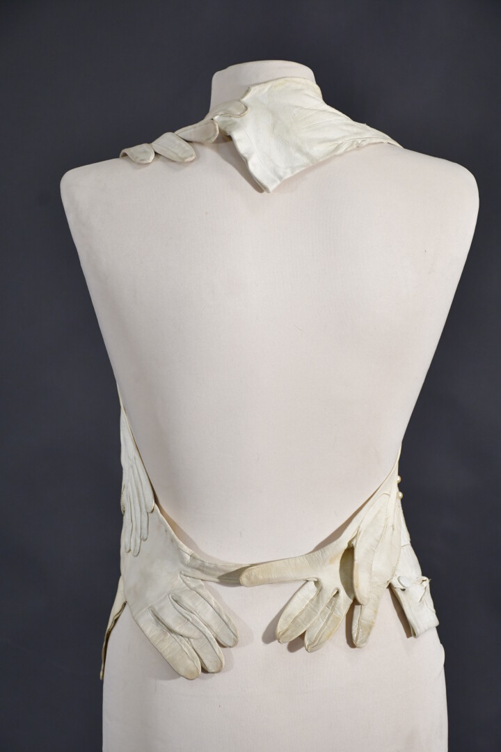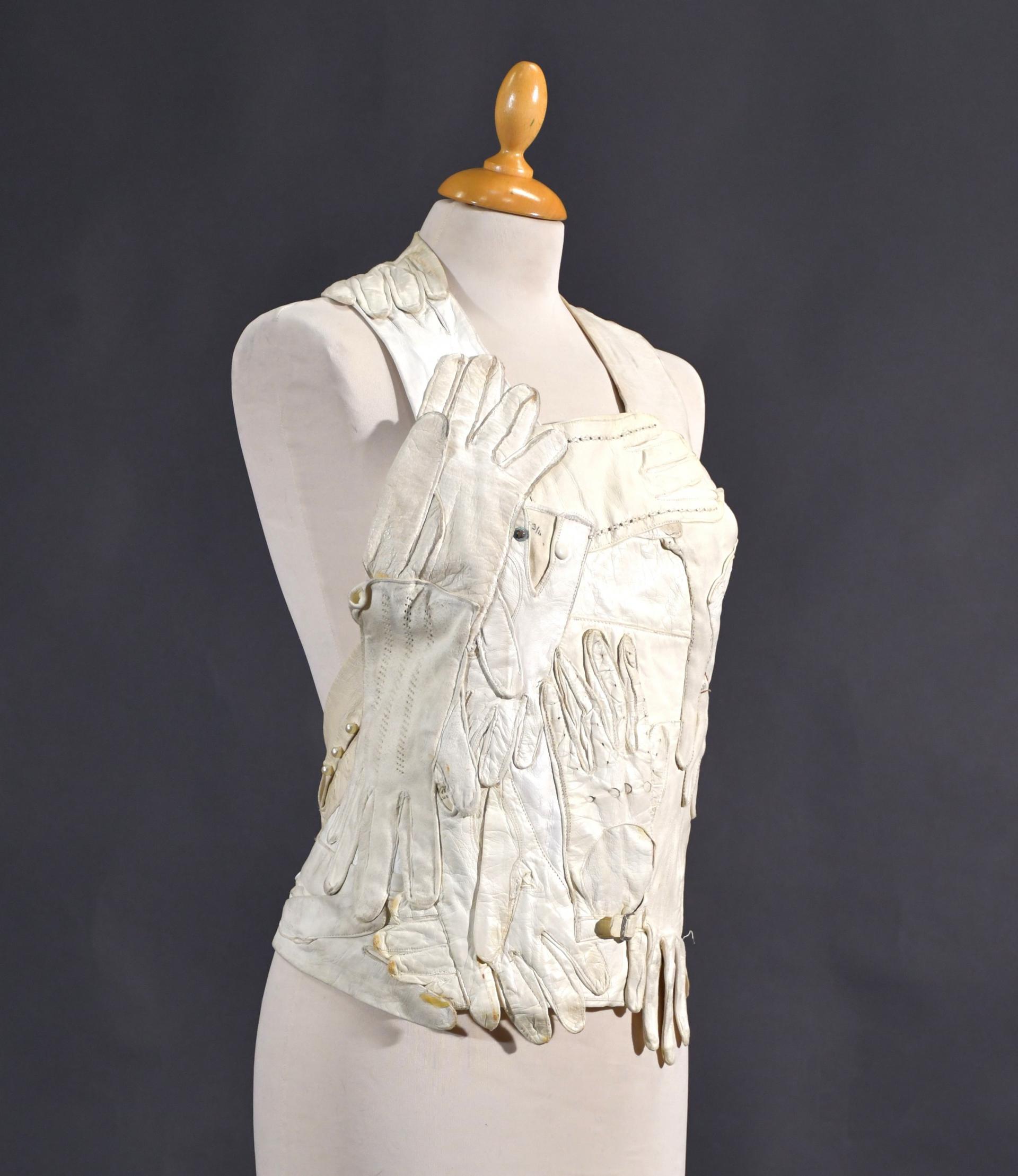 Veste plastron constituée d’une accumulation de gants divers en cuir ivoire, la plupart fin XIXème, attache à la nuque, sans manches, dos nu se terminant par deux gants se rejoignant sur la chute de reins.