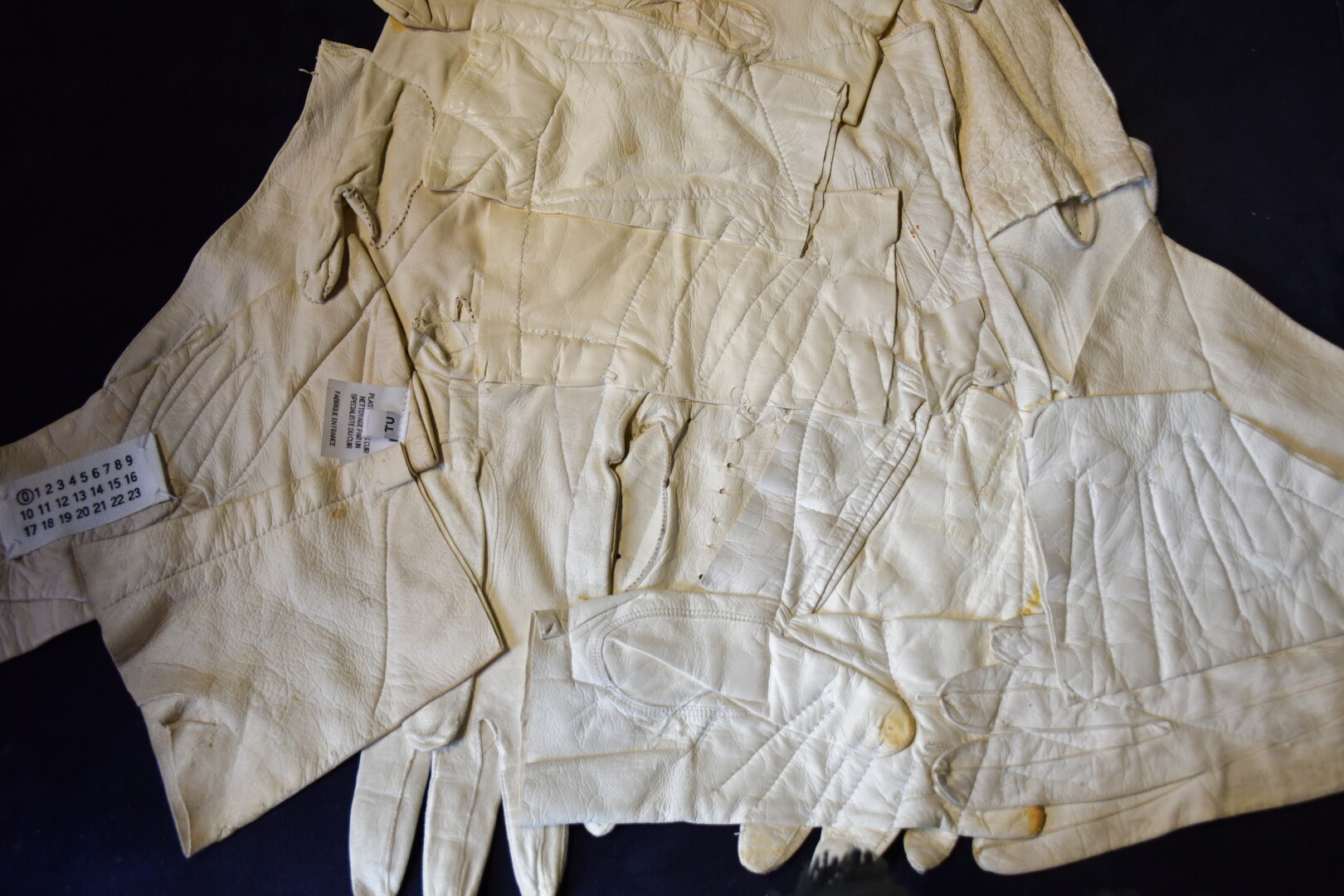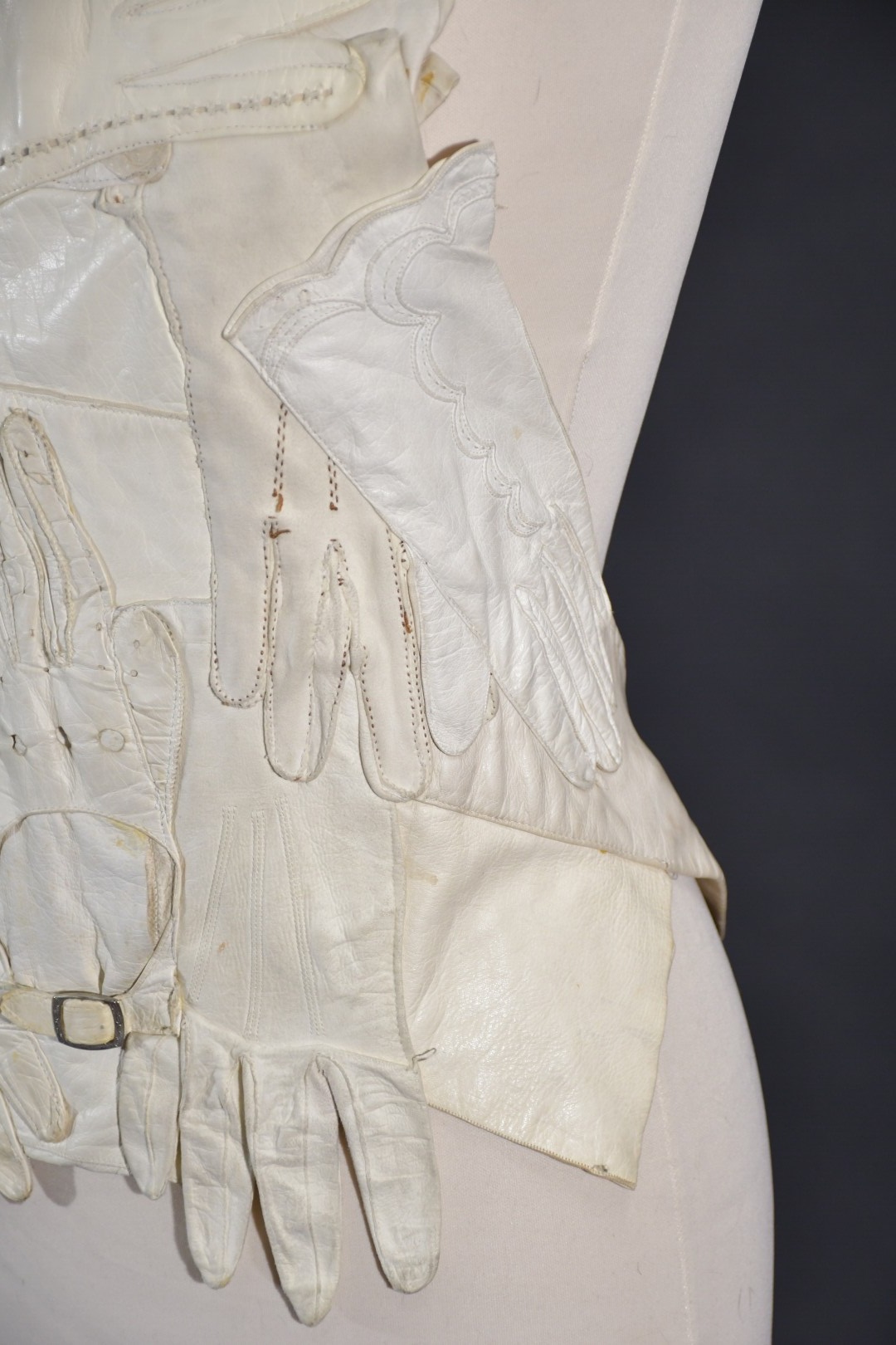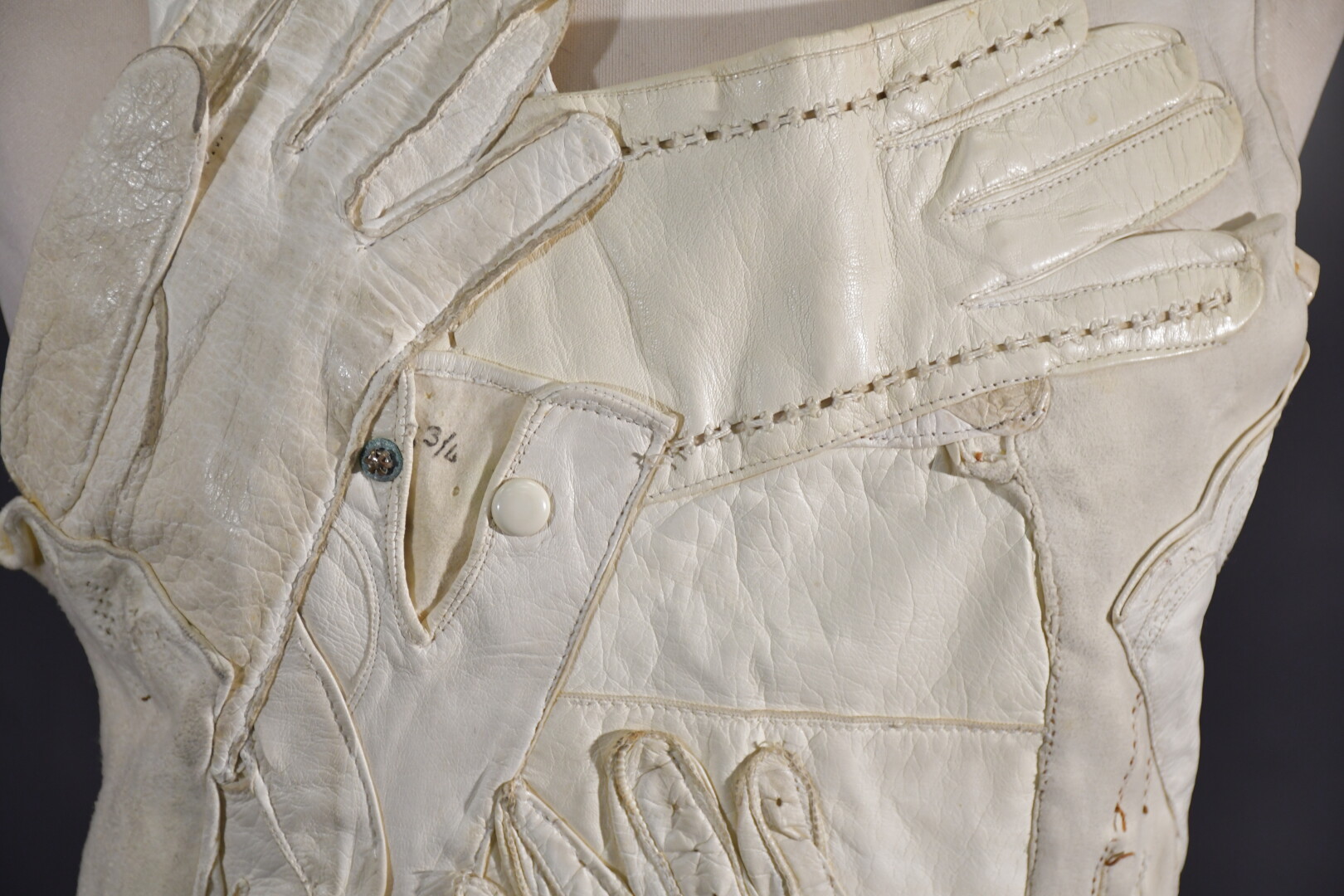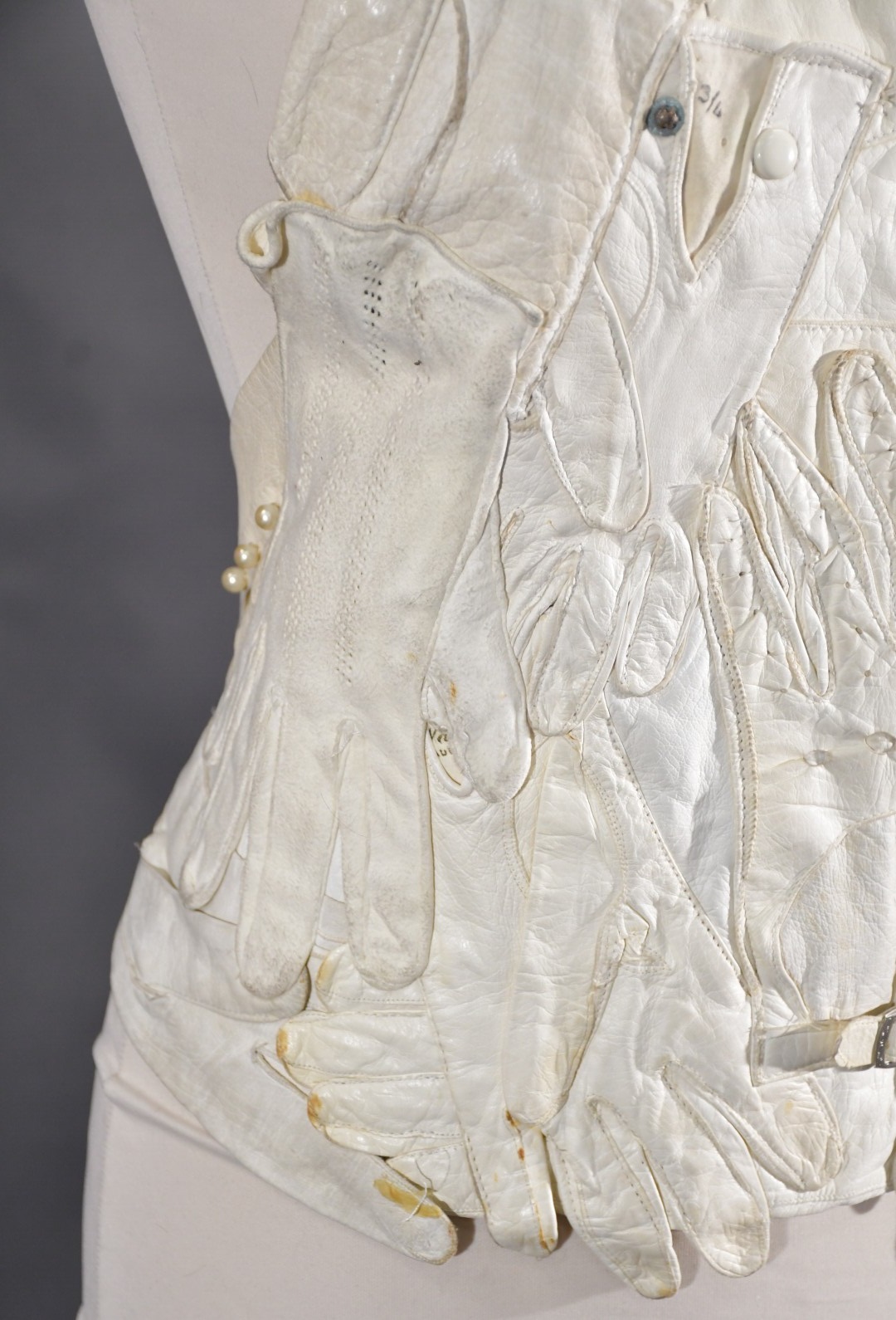 Veste plastron constituée d’une accumulation de gants divers en cuir ivoire, la plupart fin XIXème, attache à la nuque, sans manches, dos nu se terminant par deux gants se rejoignant sur la chute de reins.
