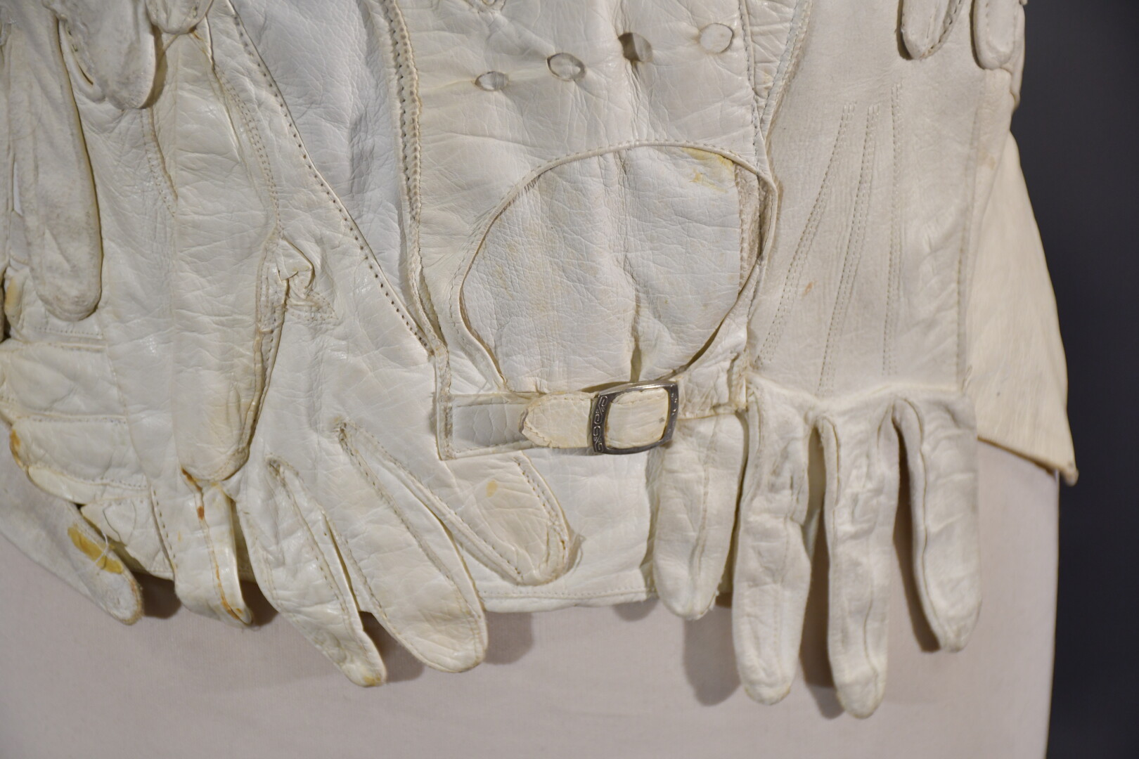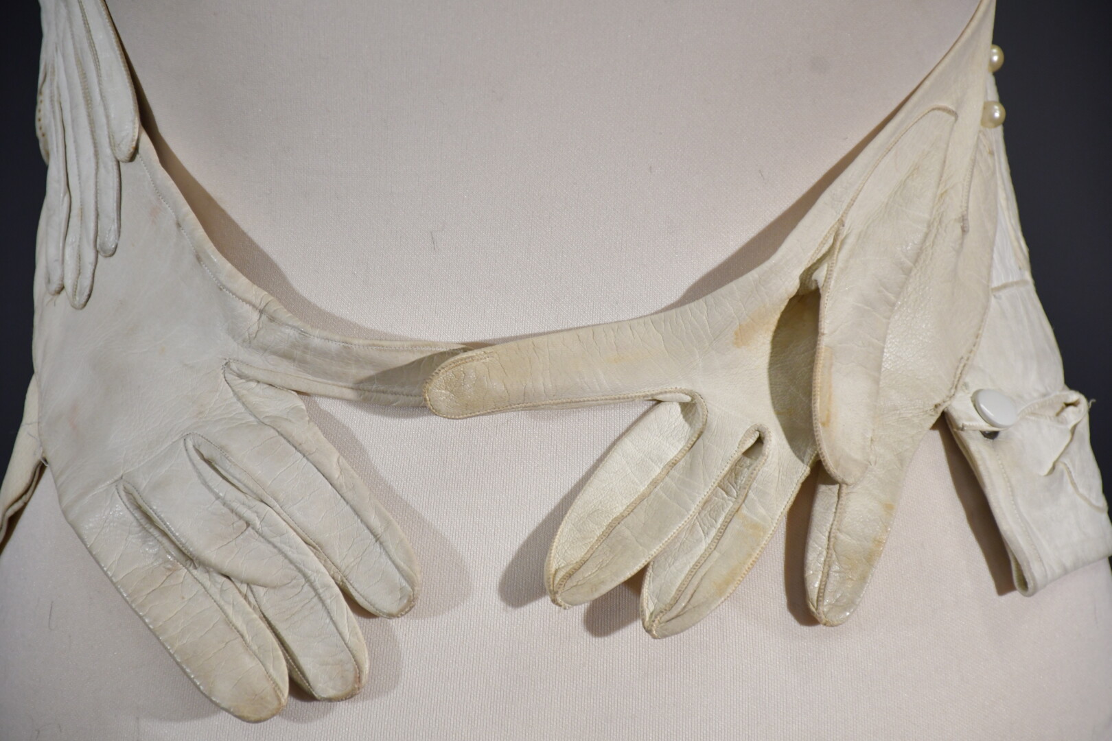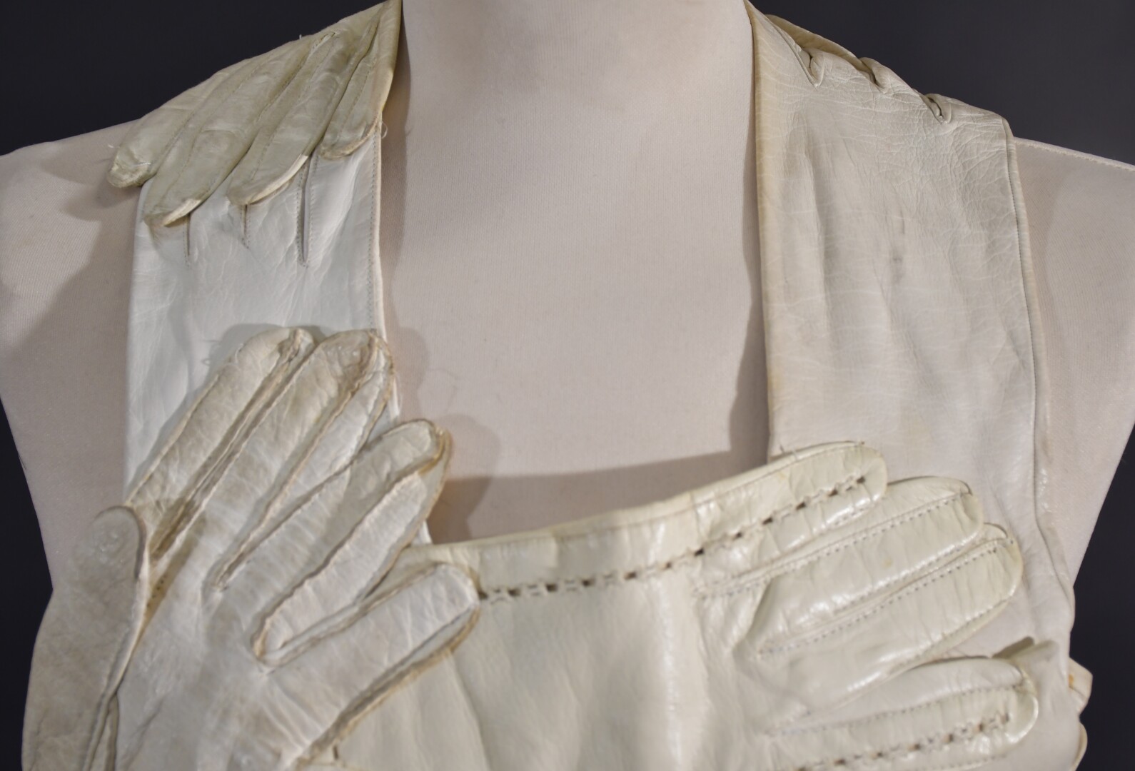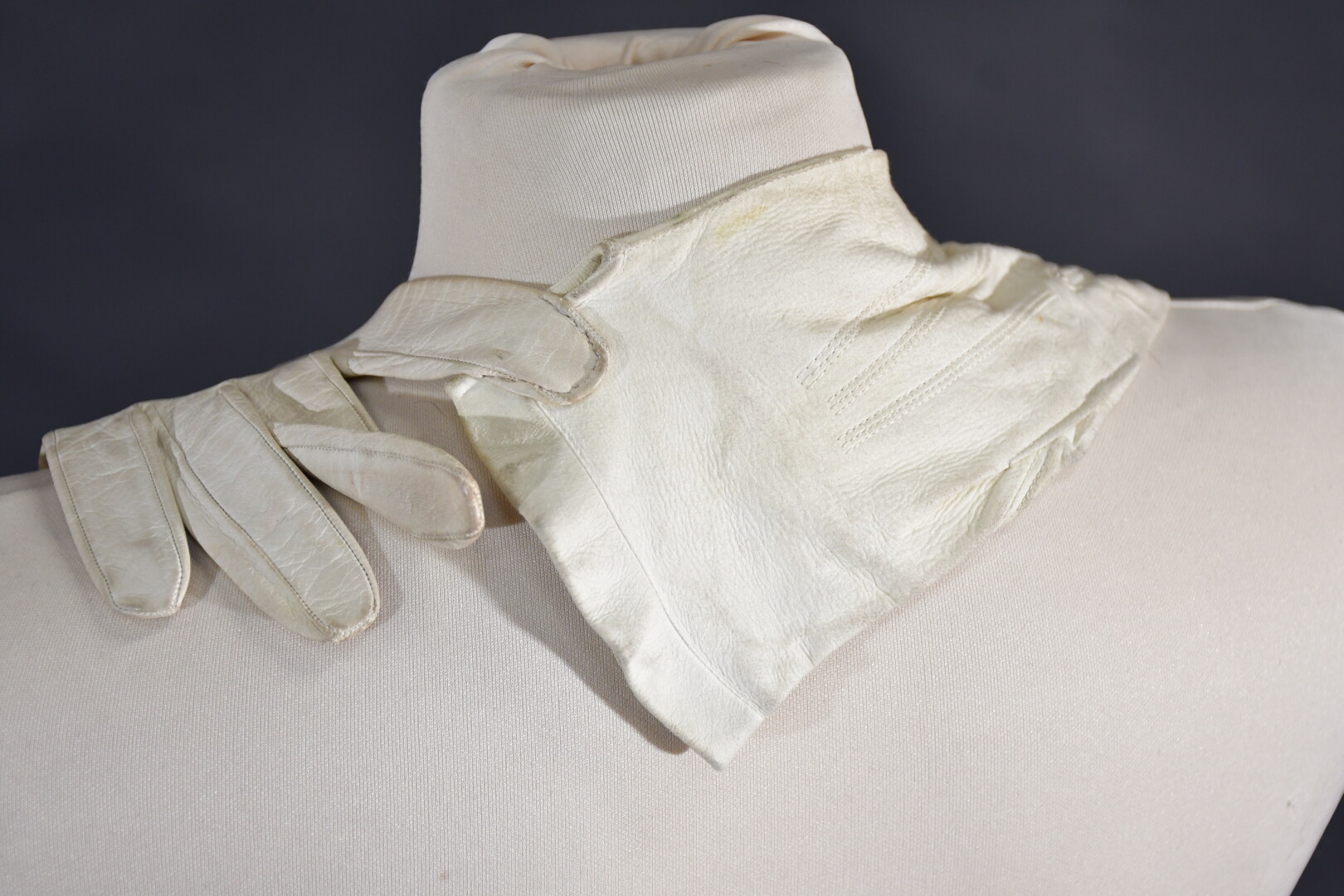 Veste plastron constituée d’une accumulation de gants divers en cuir ivoire, la plupart fin XIXème, attache à la nuque, sans manches, dos nu se terminant par deux gants se rejoignant sur la chute de reins.