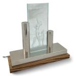 attribué à SOFAR Lampe en verre et métal chromé sur une base en bois, le plaque de verre à décor d'une Diane chasseresse Epoque Art Déco H.: 32 cm l.: 35 cm P.: 13 cm