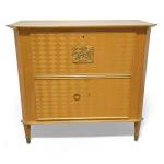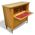 Secrétaire en bois de placage ouvrant à deux portes en partie basse et un abattant en partie haute dégageant un intérieur compartimenté, les angles à pans coupés, ornementation d'une plaque en bronze doré