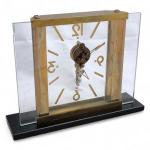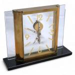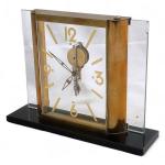 JAEGER LECOULTRE Pendule de bureau en verre et laiton reposant sur une base en marbre noir, non signée Années 1940 H.: 17 cm l.: 22.5 cm P.: 6 cm (éclat au verre, infimes égrenures au marbre)