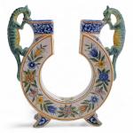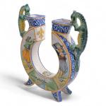 HR à Quimper Gourde annulaire en faïence à décor de sonneurs dans des paysages et fleurs, les prises zoomorphes, marquée H.: 37.5 cm l.: 37 cm (quelques sauts d'émail)