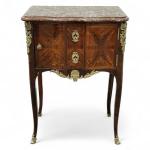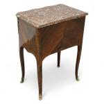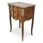 TABLE A ENCAS en bois de placage et marqueterie toutes faces, ouvrant à une porte en façade, estampillée LARDIN et poinçon de jurande JME, dessus de marbre