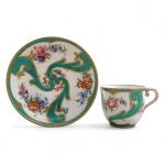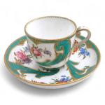 SEVRES Tasse et sa soucoupe en porcelaine à décor polychrome et or, marque au revers H. (tasse): 5.4 cm D. (soucoupe): 12 cm