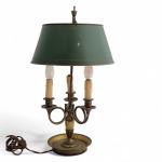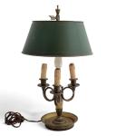 LAMPE BOUILLOTTE en bronze à trois bras de lumière en trompe de chasse, l'abat-jour à hauteur réglable en tôle laquée XIXème H.: 56 cm