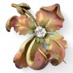 BROCHE Art Nouveau en or émaillé, stylisant une fleur, avec en son centre un diamant taille coussin calibrant environ 0,50 ct - Le feuillage est habillé de diamants taille rose