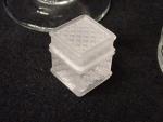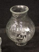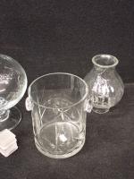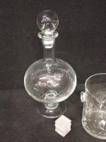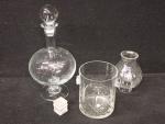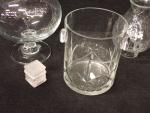 VERRERIE - Lot comprenant une carafe en verre sur piédouche et son bouchon (dim : 32x15cm) ; un verre de lampe en verre mouluré (fêle) ; un sceau à glaçons en cristal à décor de forme géométriques ciselées (dim : 14x11 cm); une boite à pilule en verre dépoli ciselé (dim : 4x3 cm) (usures)
