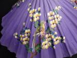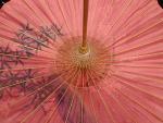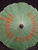 Lot de trois petites ombrelles en tissu et papier coloré. Diam : 65 et 75 cm (usures)