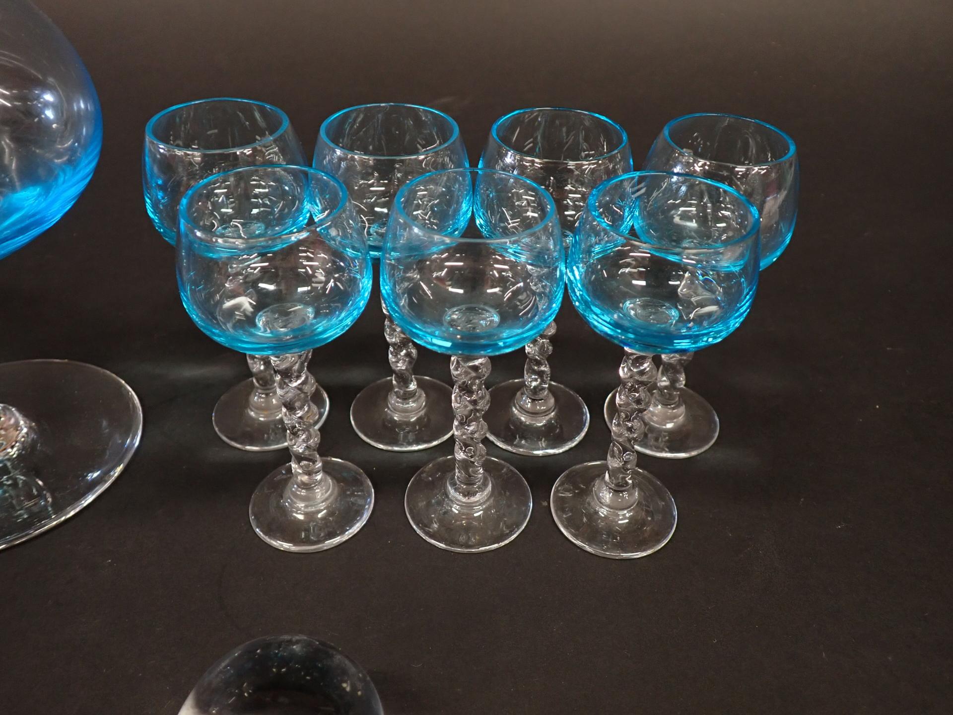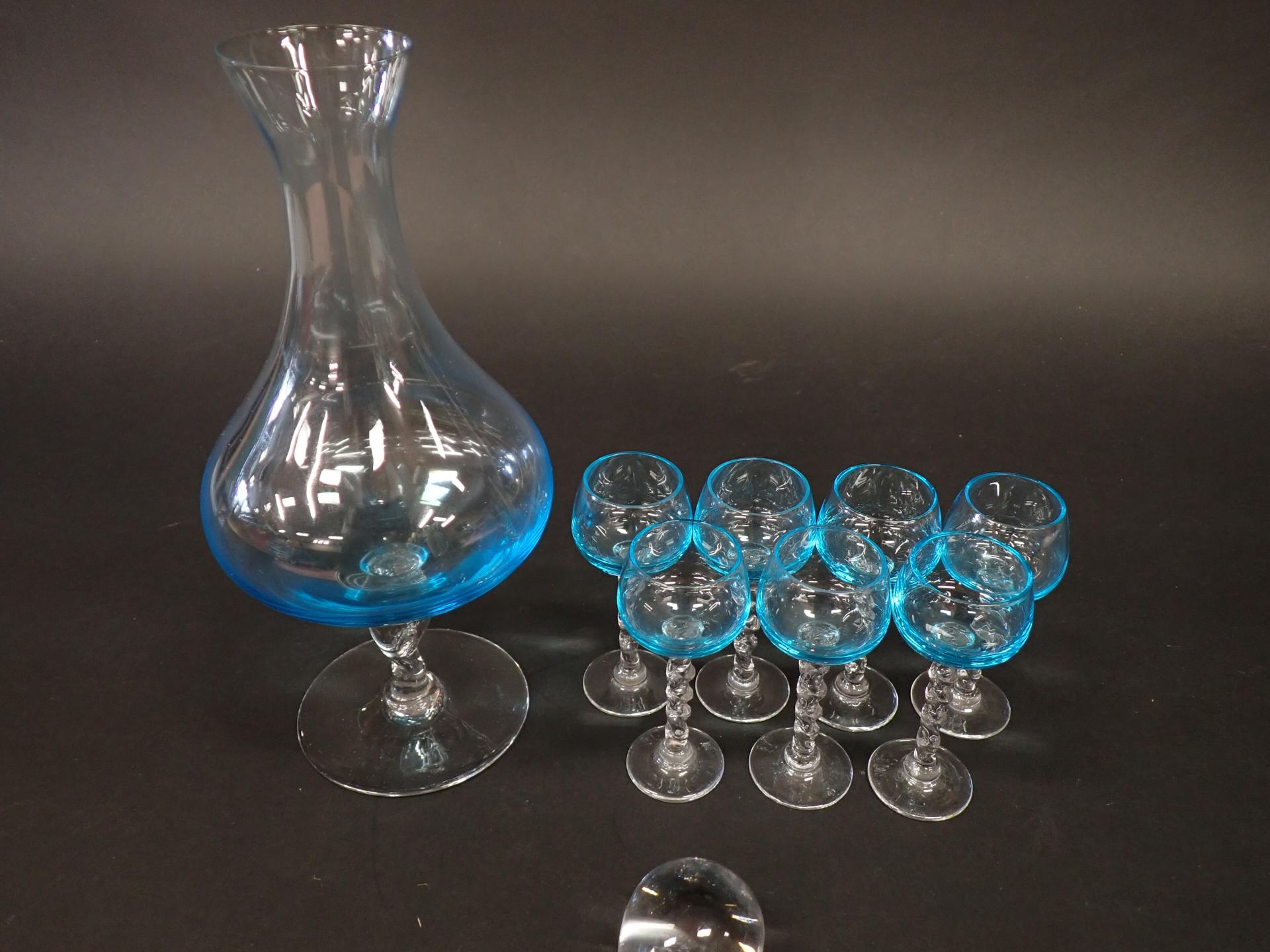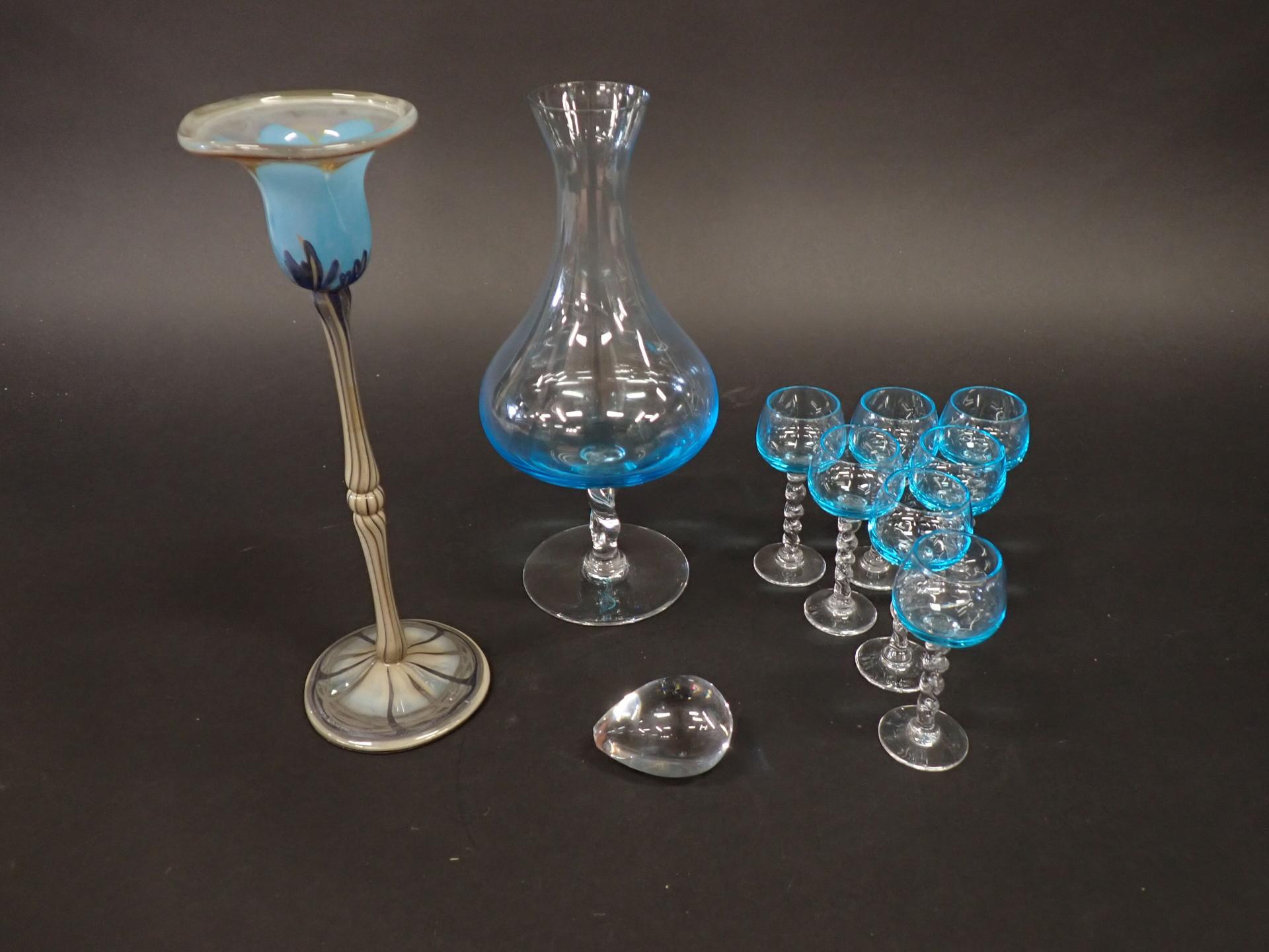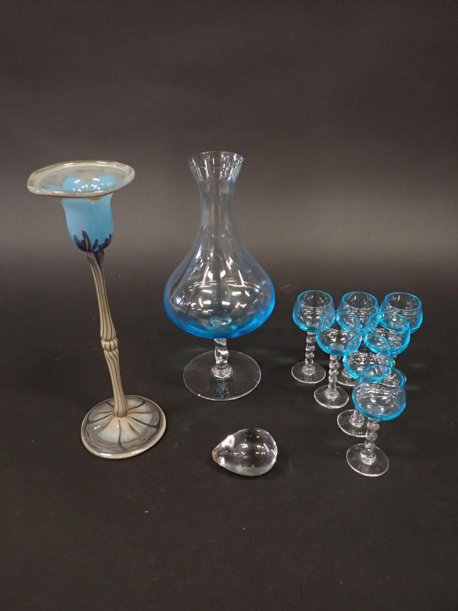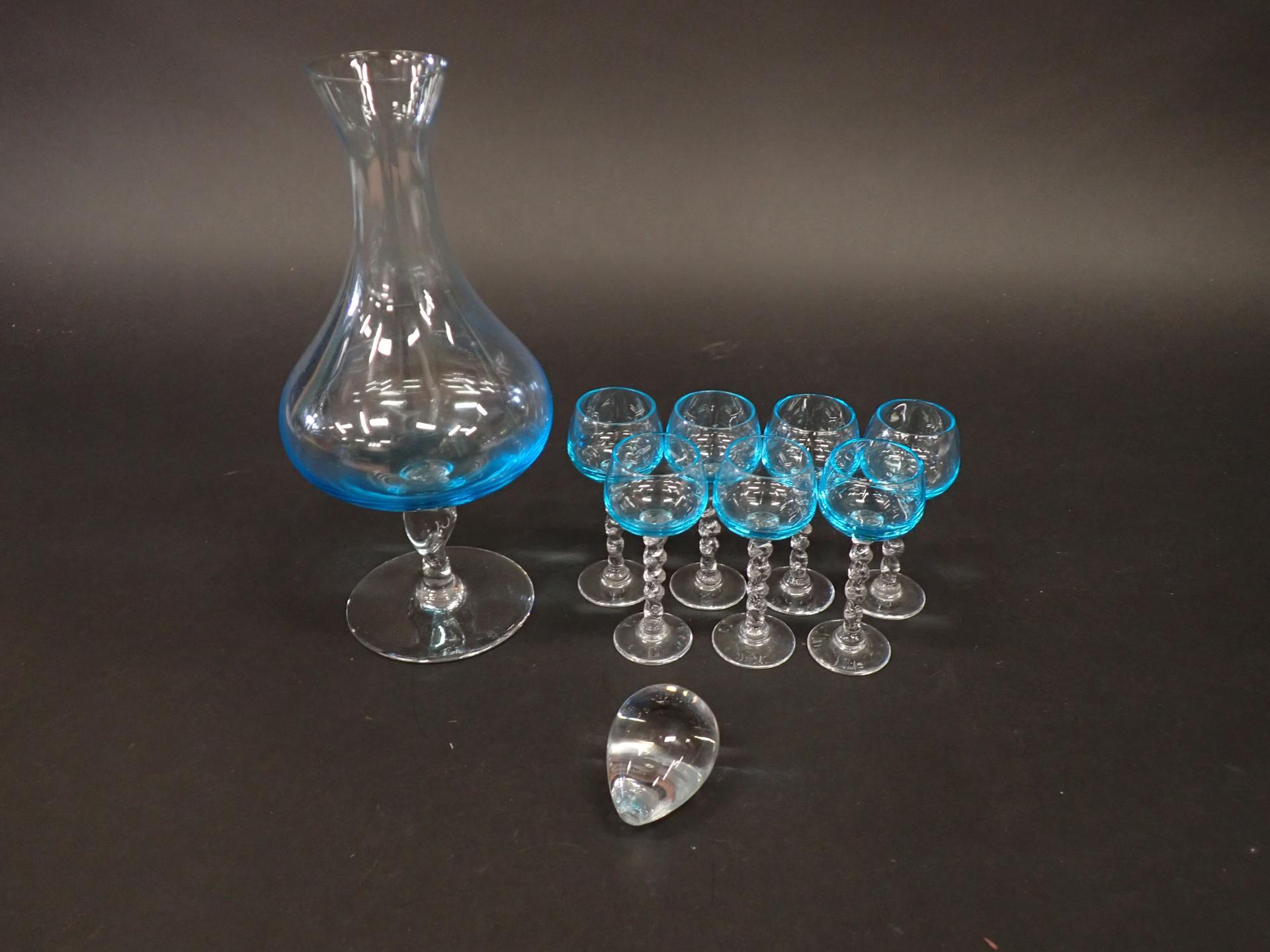 ART DE LA TABLE - VERRERIE - Partie de service à liqueur en verre tinté bleu comprenant : Une carafe piédouche (H25cm), 7 Petits verres à pied (H10cm), on y joint un presse papier en forme de goutte (6*5cm) et un bougeoir en verre tinté formant une tulipe marqué à la base (H26cm)
