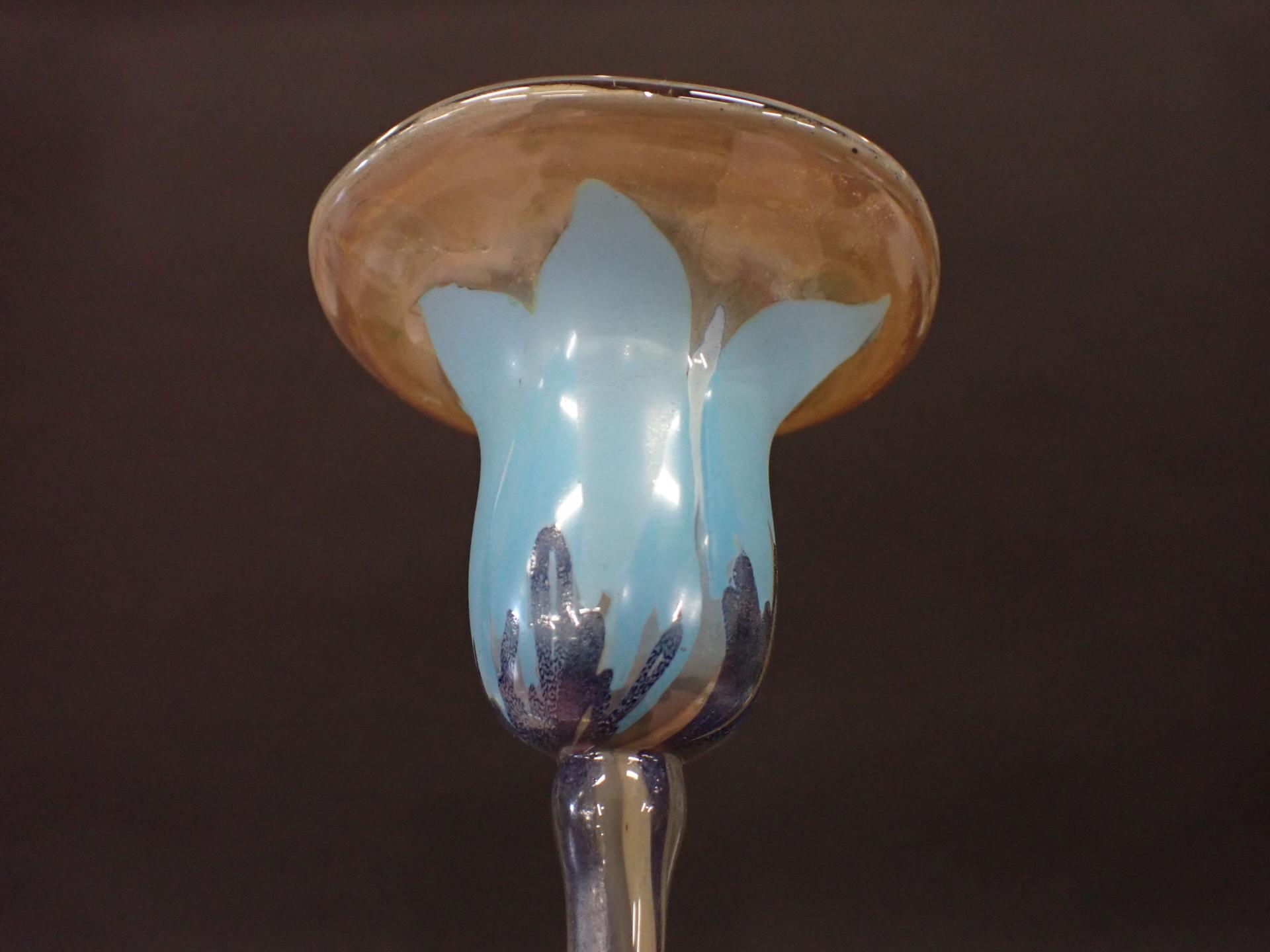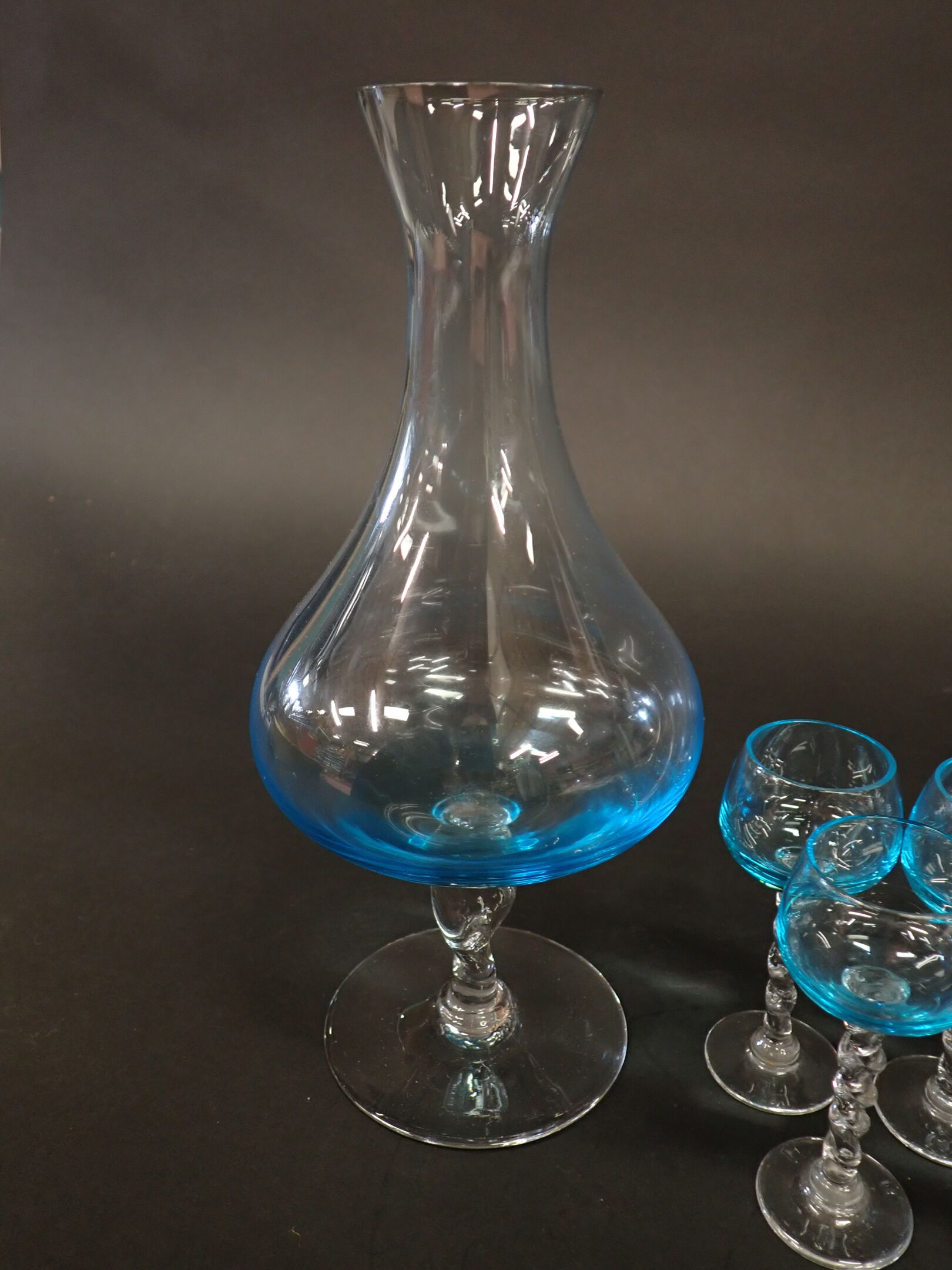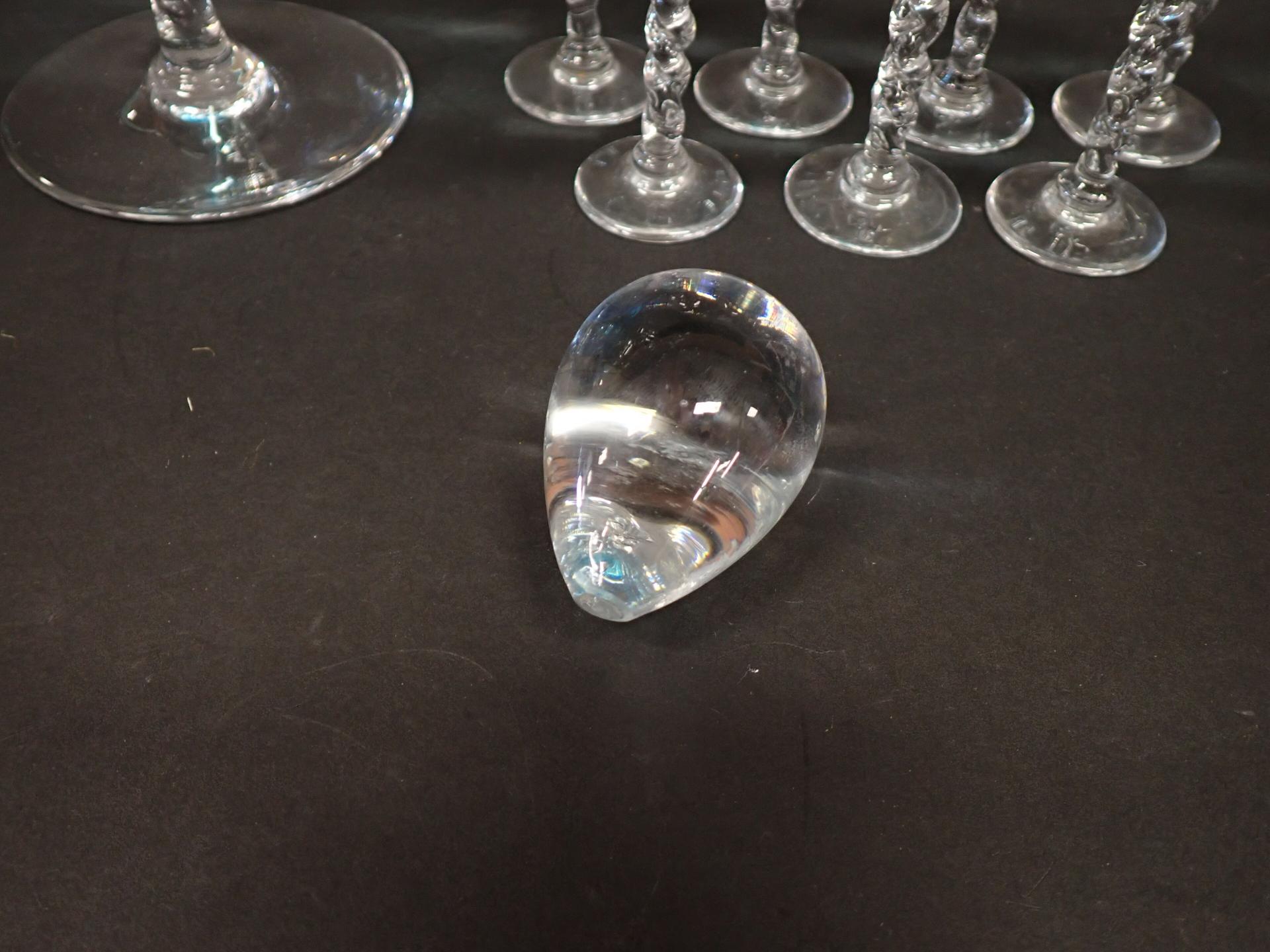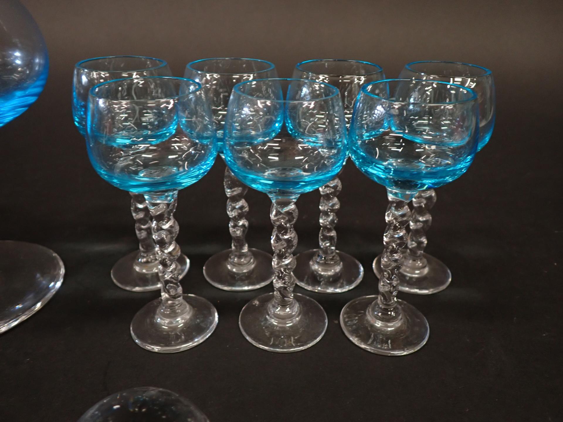 ART DE LA TABLE - VERRERIE - Partie de service à liqueur en verre tinté bleu comprenant : Une carafe piédouche (H25cm), 7 Petits verres à pied (H10cm), on y joint un presse papier en forme de goutte (6*5cm) et un bougeoir en verre tinté formant une tulipe marqué à la base (H26cm)