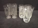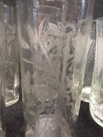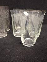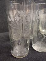 ART DE LA TABLE - VERRERIE - Lot comprenant deux parties de service de verres de table dont 4 verres à limonade en verre gravé à décor de végétaux stylisés (Hauteur : 14 cm) et 5 autres verres à limonade de style art-déco (Hauteur : 12 cm) (usures)
