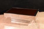 Willy RIZZO (1928-2013) dans le gout de. Table basse formant bar en acier et dessus de verre fumé marron. Piètement en retrait et plateau à glissière s'ouvrant en deux et formant bar. Circa 1970. H. 50 cm. Larg. 122 cm. Prof. 70 cm