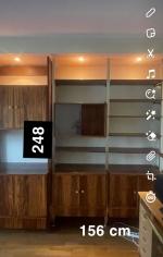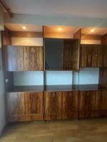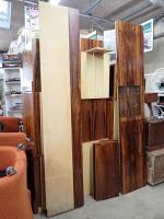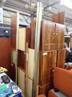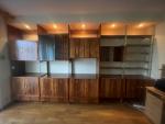 ROCHE BOBOIS Dans l'esprit de. Grande bibliothèque type Living année 1970 en placage de palissandre, la structure portante en laiton, à cinq colonnes contenant des caissons et modules d'agencement modulables. Dim : 250x440 cm (usures, rayures, a été proprement démonter par nos transporteurs plus qu'à charger ! )