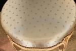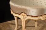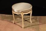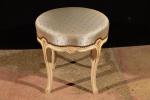 Tabouret de piano de style Louis XV en bois laqué crème, garniture de soie bleue ciel.