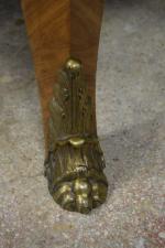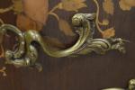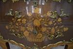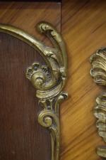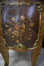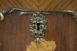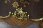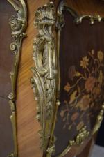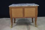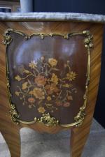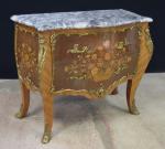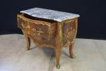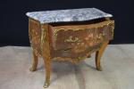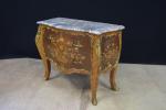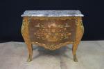Commode galbée en bois de placage ouvrant par à deux tiroirs sans traverse, à riche décor d'un panier de fleurs en marqueterie sur trois faces, ornementations en bronze doré en chutes, cartouche et sabot. Plateau de marbre veiné gris.