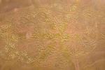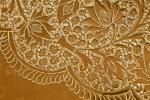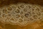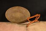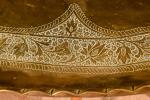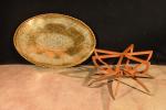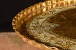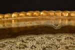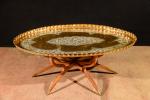 Grande table à thé formé d'un grand plateau ovale oriental en laiton gravé de branches feuillagées, bord crénelé. Long : 90 cm, sur piétement "araignée" pliant en teck en six branches, sabots en laiton. Haut : 0,45 m
