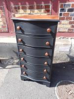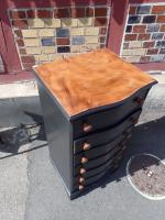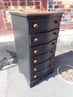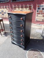 Commode étroite, la façade galbée ouvrant à six tiroirs en bois laqué noir. Dim : 100x50x45 cm (usures)