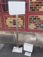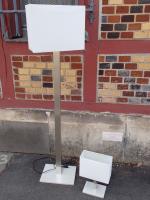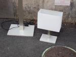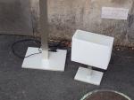 Lot comprenant : un lampadaire et une lampe de chevet en métal chromé et abat jour rectangulaire en tissu blanc. Dim : 150 cm et 36 cm (usures, fonctionnement non garanti)