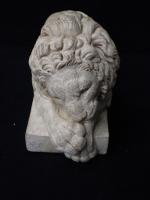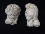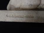 C. H. EDMOND PARIS. Deux lions couchés en plâtre patiné, pouvant former serre-livres, signés au dos. H. 15 cm. Long. 35 cm
