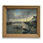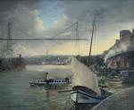 Edmond BERTREUX (1911-1991) Nantes, le port et le pont Transbordeur Huile sur isorel signée en bas à gauche 52.5 x 63.5 cm à vue