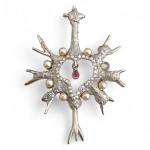 CHRISTIAN LACROIX BROCHE motif coeur avec strass, perles imitation (manque) 9x6 cm