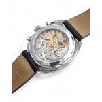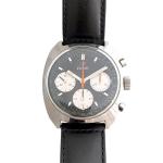 Cadran noir avec index et aiguilles luminescentes, 3 compteurs pour l'indication des heures, minutes et secondes, minuterie chemin de fer, graduation 1/5e de seconde, échelle tachymètre, signé