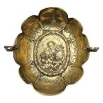COUPE ovale polylobée en argent à décor au repoussé, agrémentée de deux anses, le col gravé Travail hollandais de la fin du XVIIème 15.5 x 16 cm Poids: 171 gr