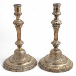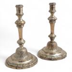 Paire de FLAMBEAUX en argent, la base ronde à décor d'une frise d'oves, surmontée d'une doucine avec filets à agrafes, cannelures torses
