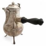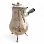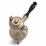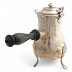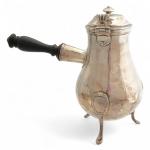 VERSEUSE couverte en argent uni, reposant sur trois pieds patins à attaches en écusson, le bec verseur cannelé, le col souligné de filets