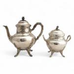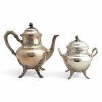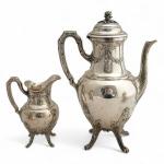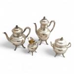 SERVICE A THE CAFE en argent, reposant sur quatre pieds en enroulements, à décor de guirlande florale, feuillage et filets, comprenant une cafetière couverte, une théière couverte, un sucrier couvert et un pot à lait