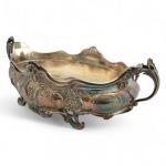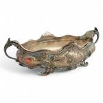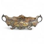 JARDINIERE ovale en argent, à décor de feuillage, fleurs, frises, enroulements, chiffrée, deux anses latérales, complète de sa doublure en métal H.: 17 cm L.: 53 cm P.: 28 cm Poids net: 1 kg 345