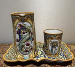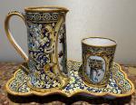ITALIE Cabaret en faïence à décor polychrome, chiffré, comprenant un plateau, une verseuse et un gobelet H. max.: 17.5 cm