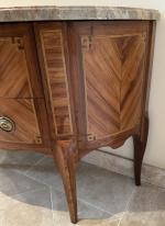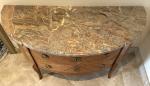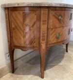 COMMODE de forme demi-lune en bois de placage, ouvrant à deux tiroirs sans traverse, reposant sur quatre pieds à pans, estampillée B.DURAND et poinçon de jurande JME dessus de marbre rapporté