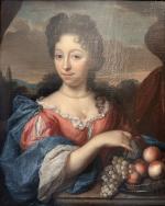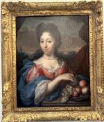 ECOLE FRANCAISE du XVIIIème Portrait de dame à la corbeille de fruits Huile sur toile 47.5 x 39 cm (restaurations)